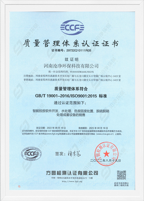 滄凈環(huán)保,是一家集科研、設計,工程施工、調試于一體的智能粉體投加系統-國家級高新技術企業(yè)【編號:GR202341000885】,旗下產品涵蓋水處理、危廢固廢處置,脫硫脫硝處理等領域,且通過ISO 9001:2015質量管理體系認證。